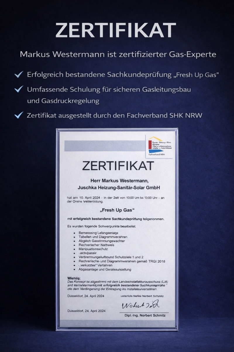 Die Firma Juschka kann mit ihrer 60-jährigen Erfahrung als kompetenter Sanitärfachbetrieb glänzen.Die Schwerpunkte des Betriebs liegen in den Bereichen Bad, Wasser, Wärme und Raumklima.Dank der langjährigen Expertise wird ein breites Spektrum an Dienstleistungen angeboten, das auf hochwertigeLösungen und zufriedene Kunden abzielt.Qualifikationen:•Meisterbetrieb im Sanitär-, Heizungs- und Klimatechnikerhandwerk.•Zertifikate für energieeffiziente Heizsysteme und erneuerbare Energien (z. B. Solarthermie, Wärmepumpen).•Erfahrung in der Planung und Umsetzung von barrierefreien Bädern.•Schulungen und Zertifikate für moderne Raumklimasteuerungssysteme.•Kompetenzen in Wasseraufbereitung und nachhaltigen Technologien.•Mitgliedschaft in Fachverbänden wie der Innung für Sanitär- und Heizungstechnik.•Regelmäßige Weiterbildung, um auf dem neuesten Stand der Technik zu bleiben.•Juschka kann durch diese Qualifikationen und seine kundenorientierte Arbeitsweise Vertrauen und Qualität garantieren.