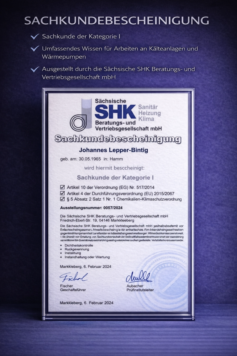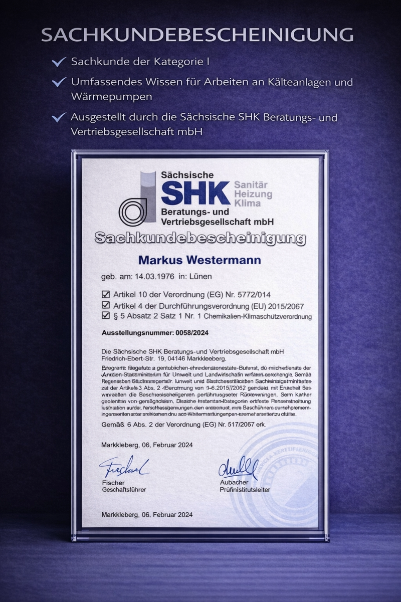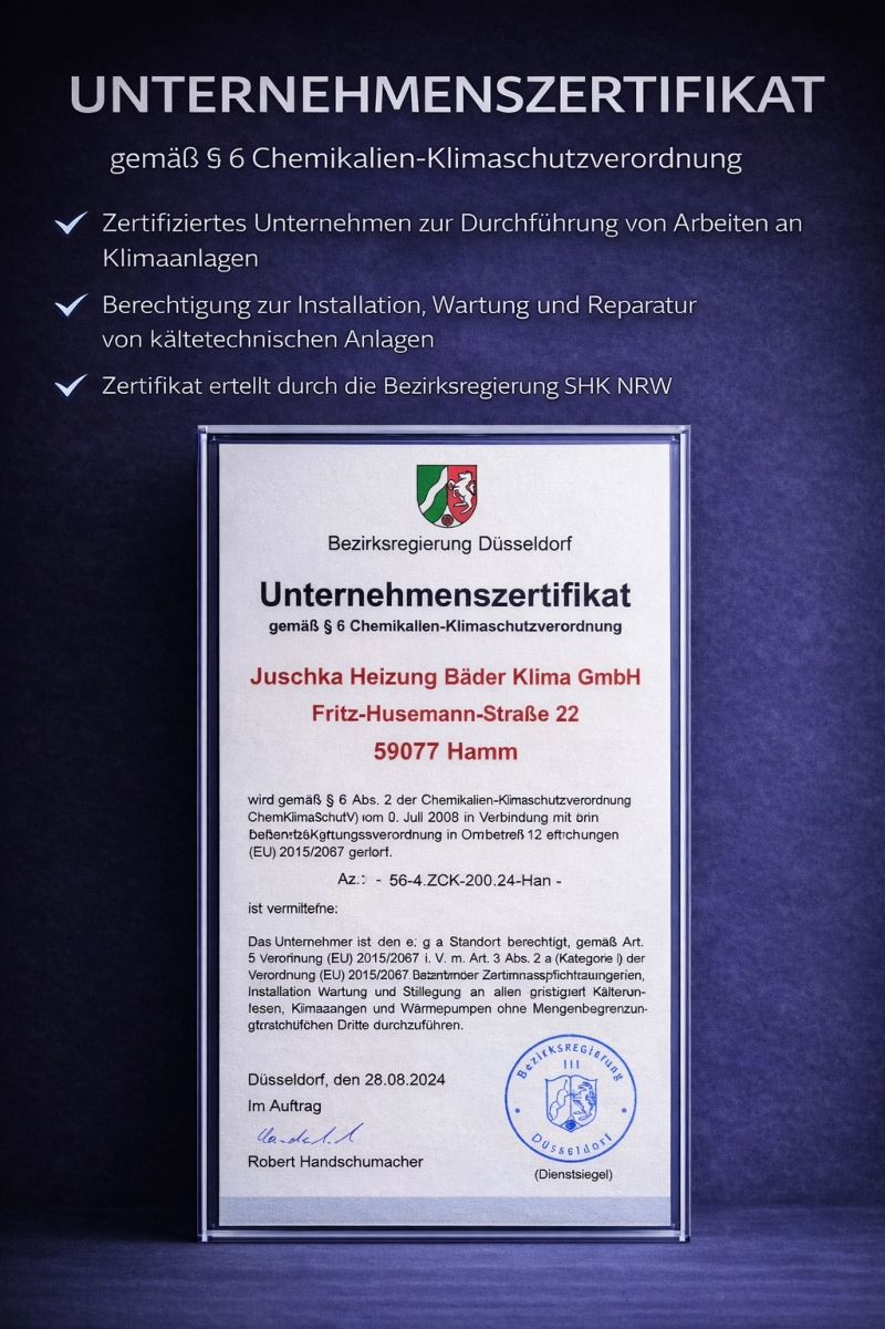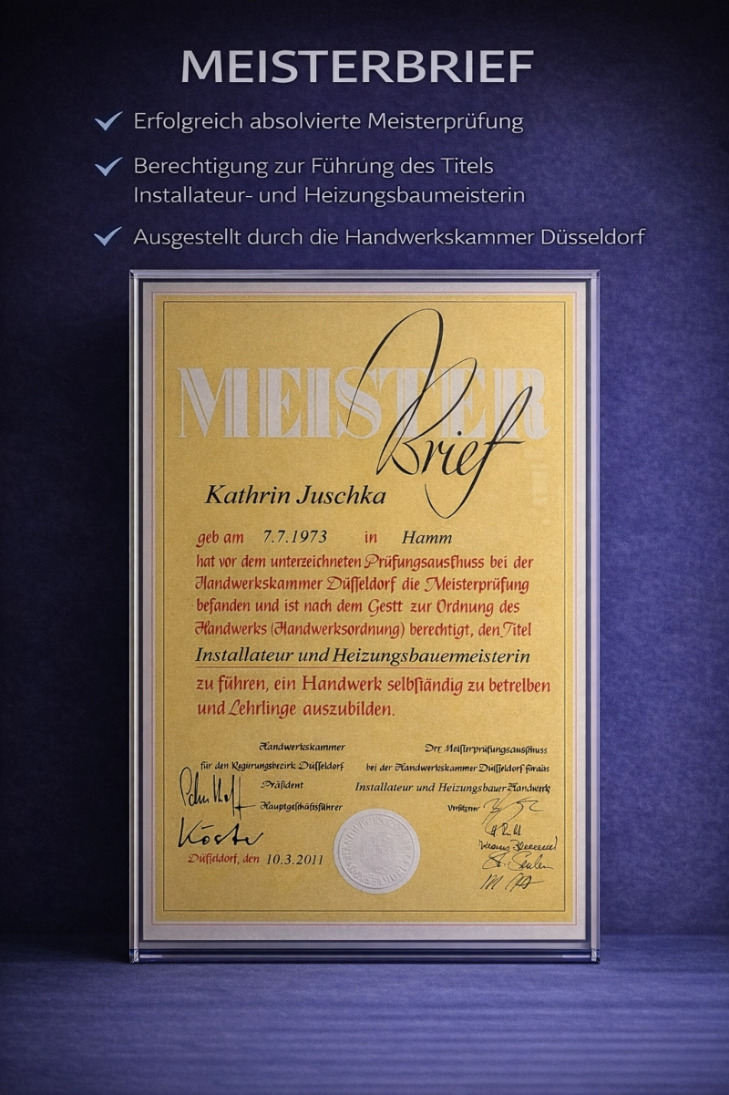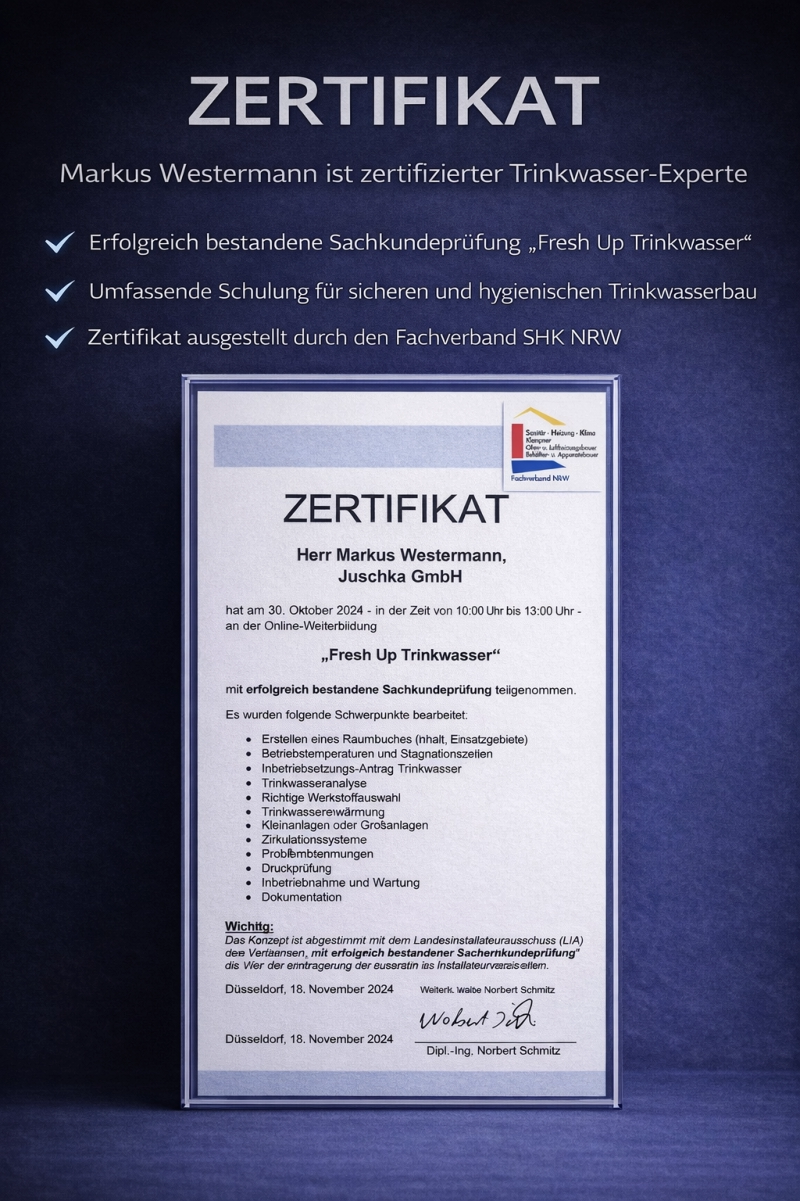 Die Firma Juschka kann mit ihrer 60-jährigen Erfahrung als kompetenter Sanitärfachbetrieb glänzen.Die Schwerpunkte des Betriebs liegen in den Bereichen Bad, Wasser, Wärme und Raumklima.Dank der langjährigen Expertise wird ein breites Spektrum an Dienstleistungen angeboten, das auf hochwertigeLösungen und zufriedene Kunden abzielt.Qualifikationen:•Meisterbetrieb im Sanitär-, Heizungs- und Klimatechnikerhandwerk.•Zertifikate für energieeffiziente Heizsysteme und erneuerbare Energien (z. B. Solarthermie, Wärmepumpen).•Erfahrung in der Planung und Umsetzung von barrierefreien Bädern.•Schulungen und Zertifikate für moderne Raumklimasteuerungssysteme.•Kompetenzen in Wasseraufbereitung und nachhaltigen Technologien.•Mitgliedschaft in Fachverbänden wie der Innung für Sanitär- und Heizungstechnik.•Regelmäßige Weiterbildung, um auf dem neuesten Stand der Technik zu bleiben.•Juschka kann durch diese Qualifikationen und seine kundenorientierte Arbeitsweise Vertrauen und Qualität garantieren.